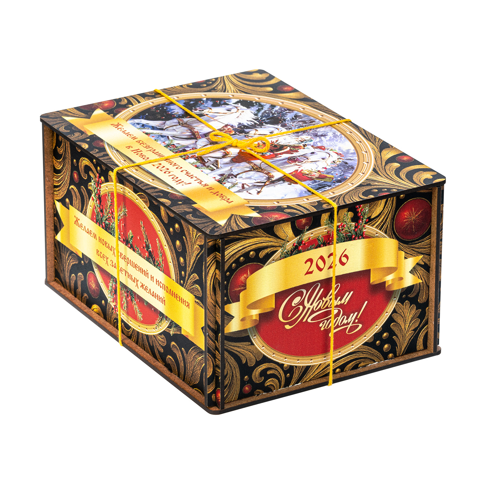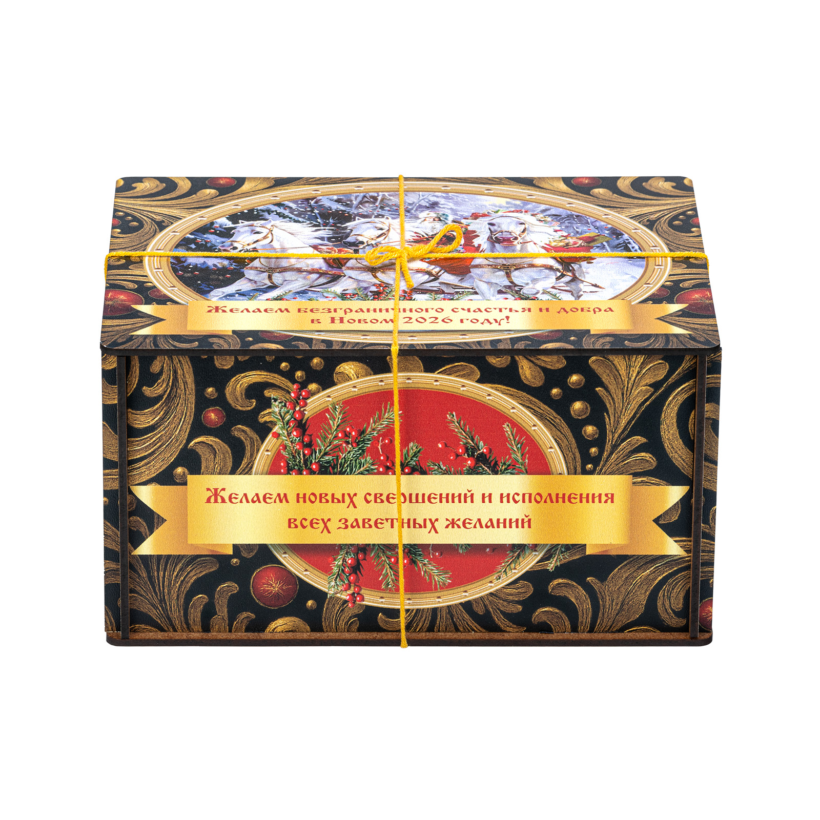Ищете новогодний сладкий подарок для взрослого сластены? Тогда набор “Посылка Черный бархат” - это то, что вам нужно! В его состав входит целых полтора килограмма разнообразных отборных сладостей на любой вкус! В нем есть шоколадные конфеты с самыми разнообразными начинками, батончики, печенье, халва, а также многие другие любимые лакомства. Кроме сладкого наполнения, в состав подарка входит небольшой памятный сувенир в виде символа наступающего года. Все это бережно упаковано в празднично украшенный деревянный ящичек, перетянутой ярко-желтой ручкой-шнурком. Прям настоящая волшебная посылка!