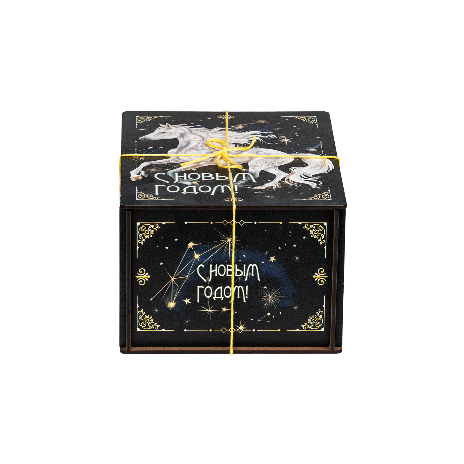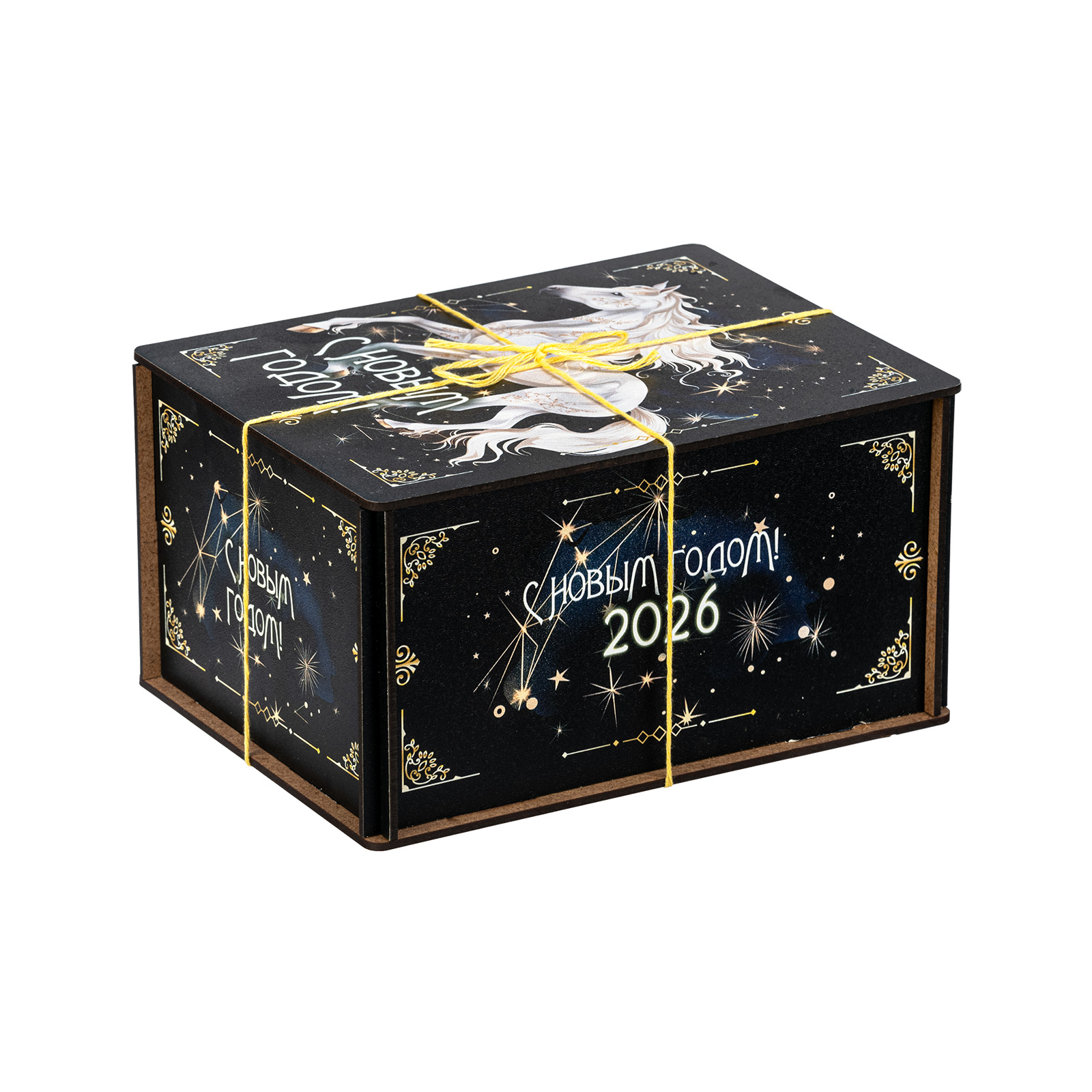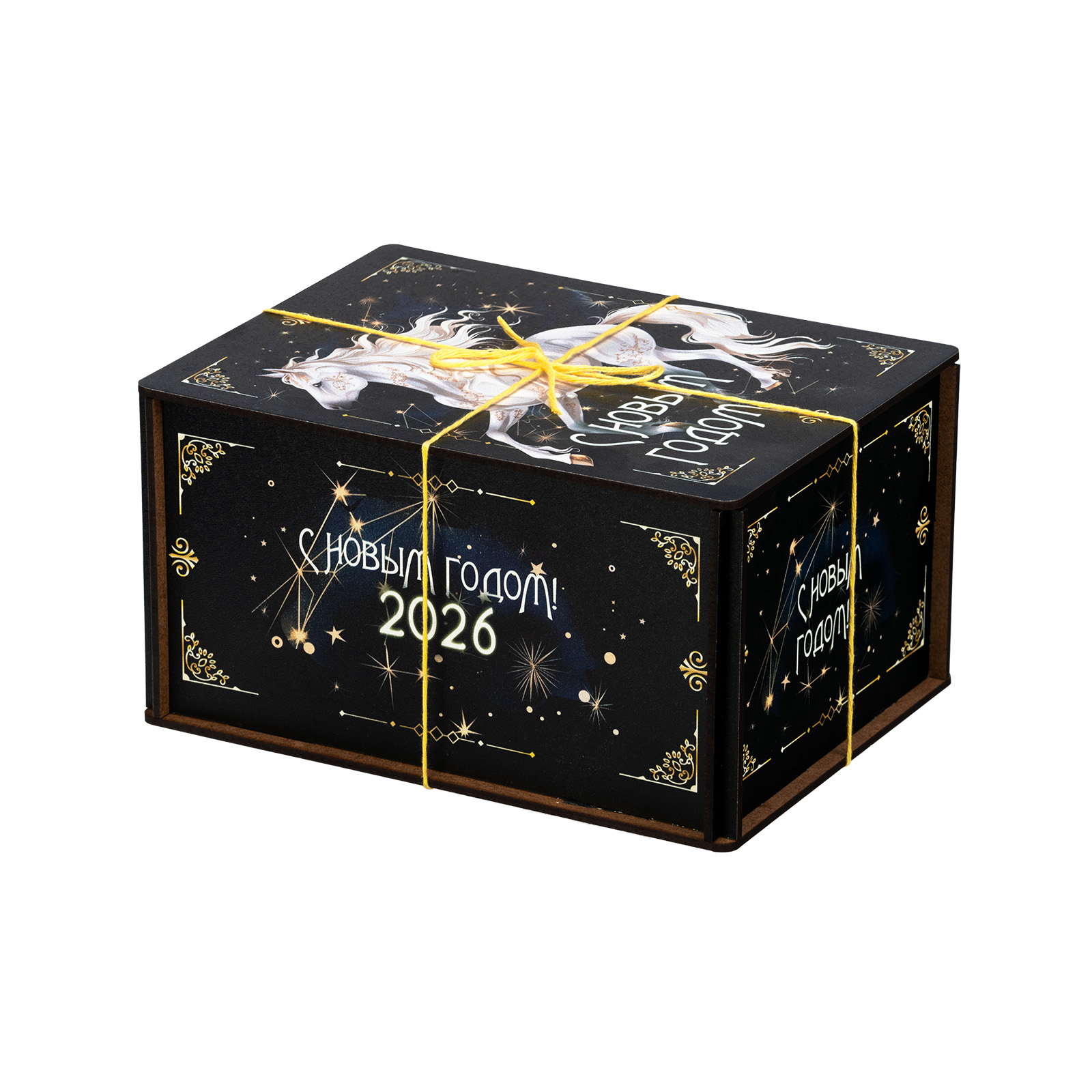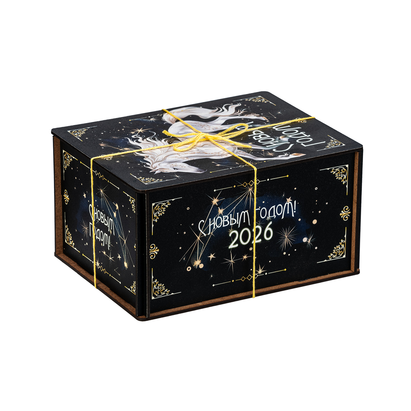 Новогодние сладкие подарки с изображением символа наступающего года всегда пользуются спросом! “Созвездие коня” - это конфетный набор, помещенный в небольшой деревянный ящичек. Упаковка оформлена в темные тона, разбавленные небольшими контрастными элементами: яркой веревочкой, небольшими орнаментами и поздравительными надписями. На крышке подарка находится большое изображение символа наступающего года - белоснежного благородного коня, который словно парит по ночному небу. За счет такого исполнения подарок подойдет для вручения подростку или взрослому. В состав набора входят вкусные сладости и небольшой памятный сувенир в виде символа 2026 года.