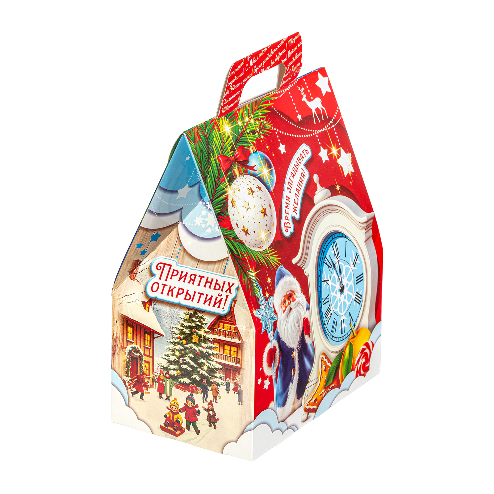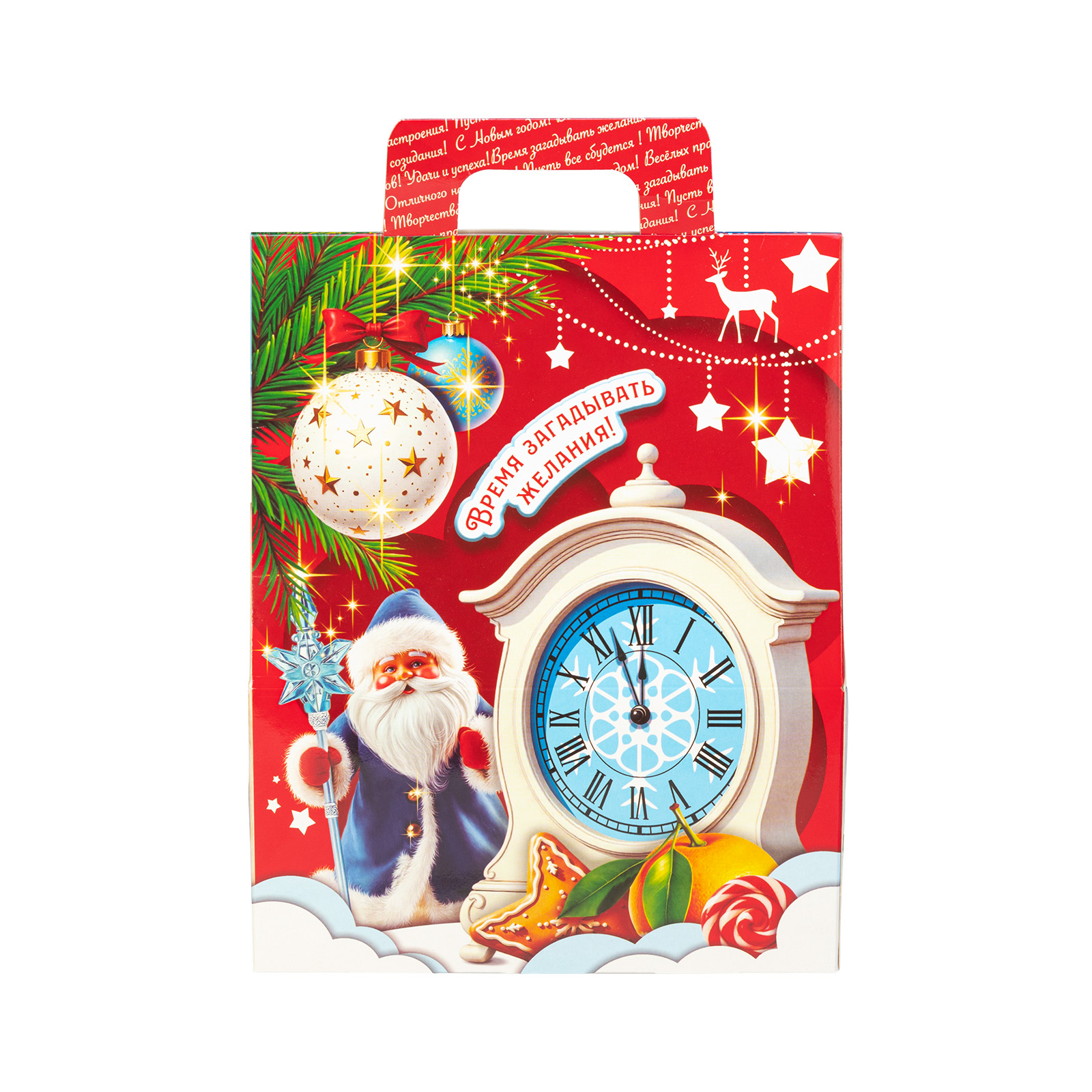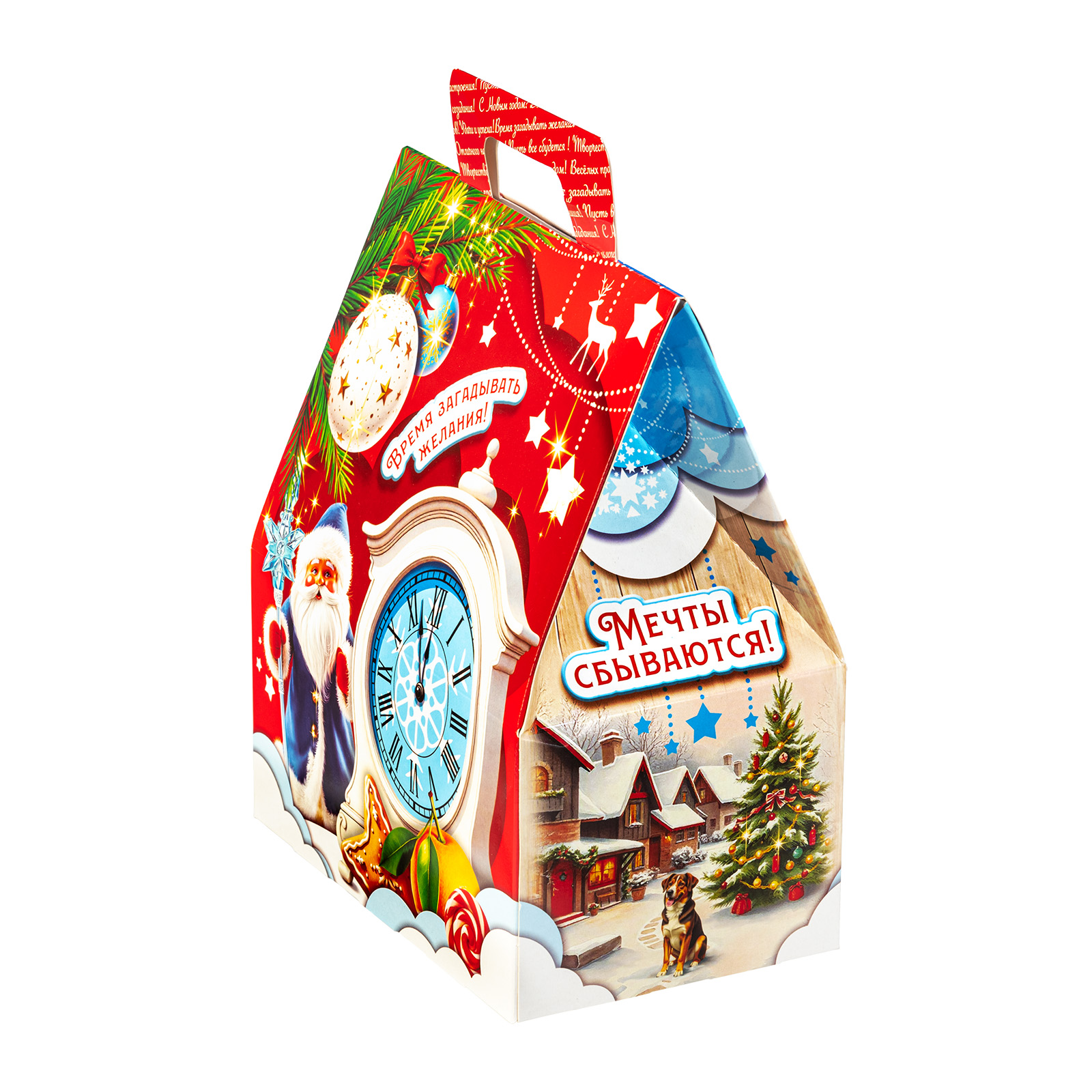 Этот небольшой, но очень привлекательный подарочный набор можно смело вручить как ребенку, так и взрослому. “Заветный подарок” - это небольшая картонная коробочка в форме домика. Со всех сторон упаковка украшена различными праздничными символами: подарки, мандарины, елочные игрушки - все это сразу создает настроение приближающегося праздника. Внутри находятся отборные вкусные сладости под любые предпочтения: желе, батончики, шоколадные конфеты, вафли - каждый найдет лакомство по вкусу.